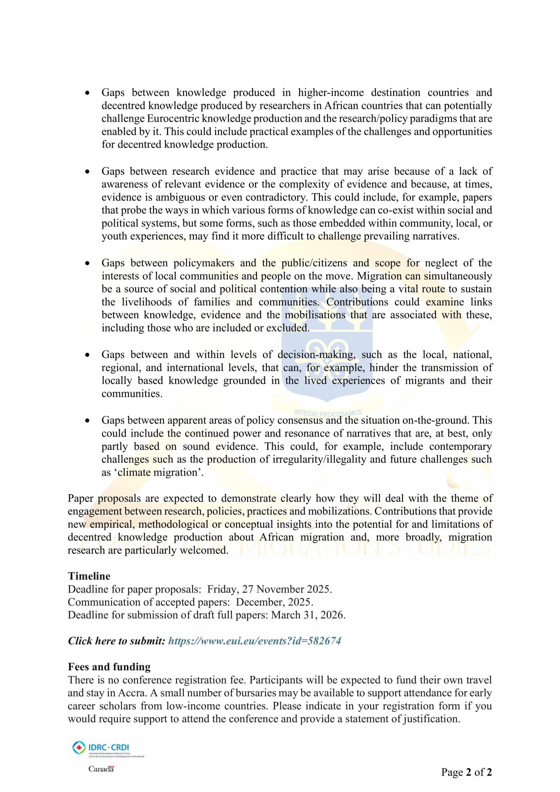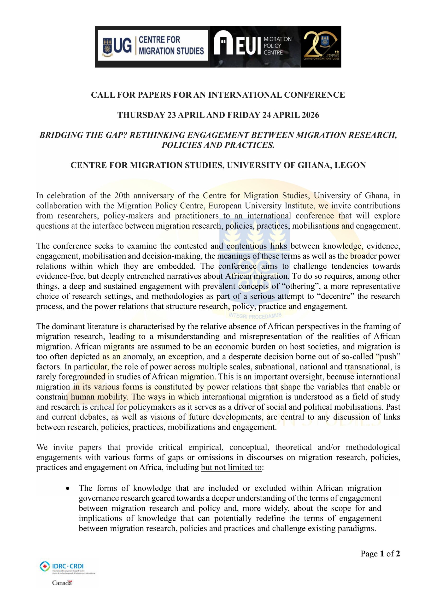 Organised in partnership with the Migration Policy Centre, European University Institute (EUI), the conference will explore the theme: “Bridging the Gap? Rethinking Engagement Between Migration Research, Policies and Practices.” The event will bring together researchers, policymakers, and practitioners to examine the intersections between migration research, policy, and practice, with a focus on African perspectives and inclusive, evidence-based approaches.